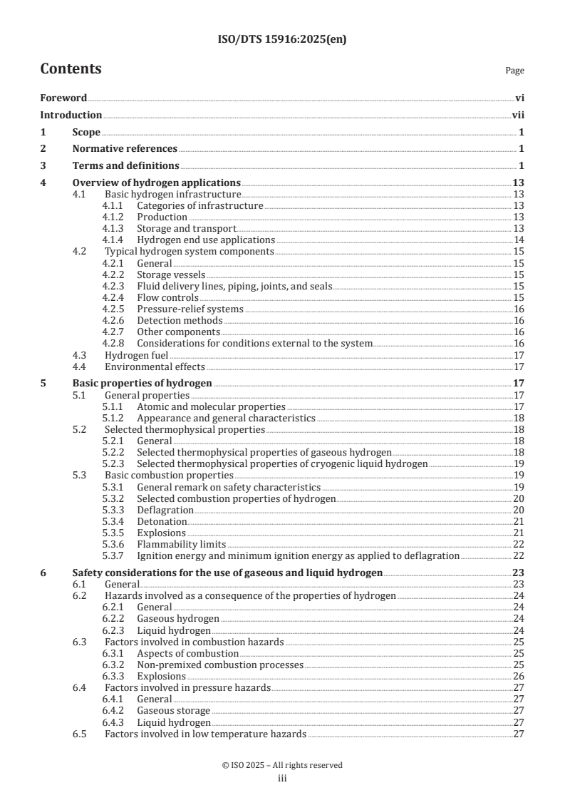 This Technical Specification provides guidelines for the use of hydrogen in its gaseous and liquid forms as well as its storage in either of these or other forms (hydrides). It identifies the basic safety concerns, hazards and risks, and describes the properties of hydrogen that are relevant to safety. Detailed safety requirements associated with specific hydrogen applications are treated in separate International Standards. “Hydrogen” in this paper means normal hydrogen (1H2), not deuterium (2H2) or tritium (3H2).