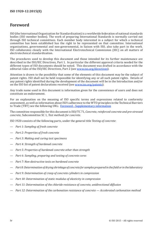 ISO 1920-12:2015 is a standard published by the International Organization for Standardization (ISO). Its full title is "Testing of concrete - Part 12: Determination of the carbonation resistance of concrete - Accelerated carbonation method". This standard covers: This procedure specified in ISO 1920-12:2015 is a method for evaluating the carbonation resistance of concrete using an accelerated carbonation test. After a period of preconditioning, the test is carried out under controlled exposure conditions using an increased level of carbon dioxide to which, the vertical sides of the specimen are exposed. The test results are not designated to set performance requirements but to compare the carbonation resistance of different concretes of the same strength class, which are used in the same environmental conditions.
