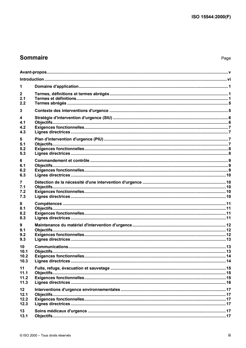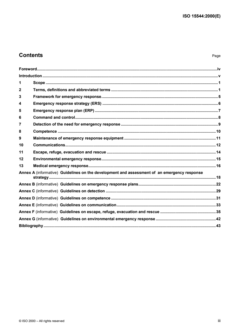 ISO 15544:2000 is a standard published by the International Organization for Standardization (ISO). Its full title is "Petroleum and natural gas industries - Offshore production installations - Requirements and guidelines for emergency response". This standard covers: This International Standard describes objectives, functional requirements and guidelines for emergency response (ER) measures on installations used for the development of offshore hydrocarbon resources. It is applicable to fixed offshore structures or floating production, storage and off-take systems. NOTE For mobile offshore units, the ER plans developed in conformance with the requirements and recommendations of the International Maritime Organization (IMO) are generally adequate for the normal, independent operation of the unit in most locations. The following aspects of ER planning are generally not addressed by IMO and should be specially considered: _ area evacuation, e.g. precautionary evacuation in areas of tropical revolving storms; _ combined operations wherein an integrated command and ER system should be developed; _ arctic operations; _ uncontrolled flow from a well.