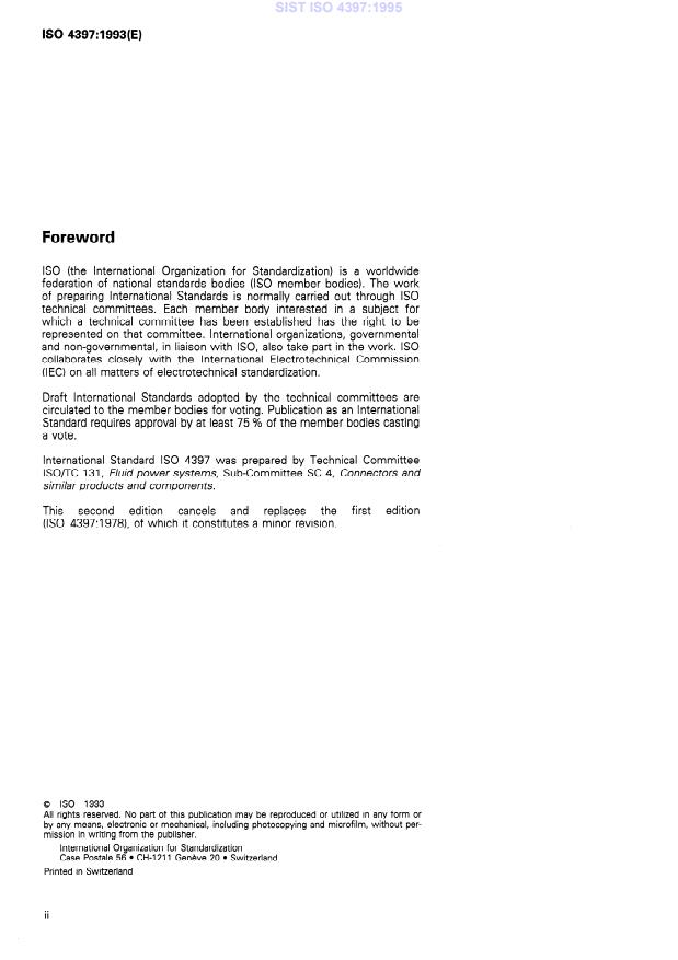 ISO 4397:1993 is a standard published by the International Organization for Standardization (ISO). Its full title is "Fluid power systems and components — Connectors and associated components — Nominal outside diameters of tubes and nominal inside diameters of hoses". This standard covers: Specifies two series of diameters: a series of nominal outside diameters for rigid or semi-rigid tubes, irrespective of material composition, and a series of nominal inside diameters for hoses made of rubber or plastic.