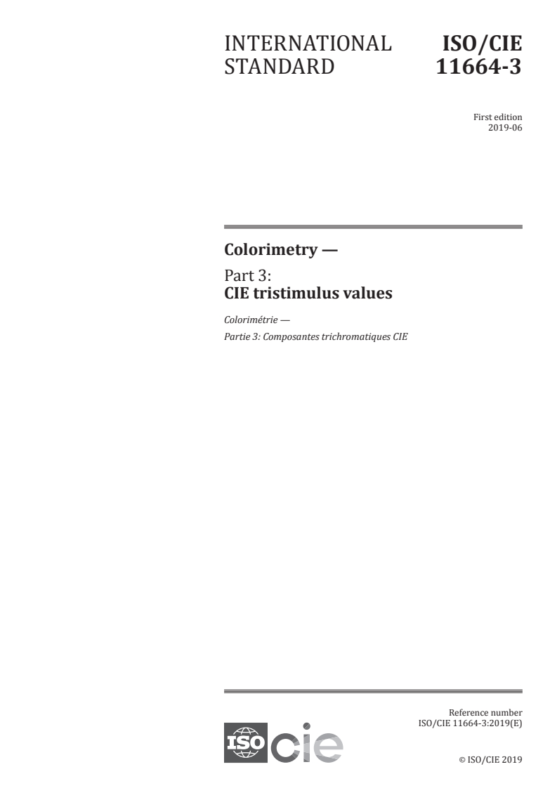 ISO/CIE 11664-3:2019 - Colorimetry — Part 3: CIE tristimulus values Released:6/12/2019