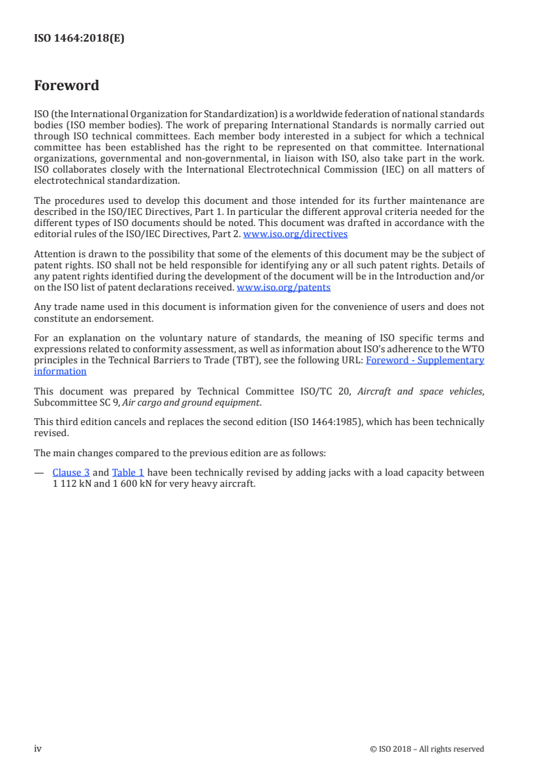 ISO 1464:2018 specifies the minimum clear space to be provided beneath the aircraft main jacking points, in order to accommodate tripod jacks and thus ensure adequate clearance between the jacks and the adjacent aircraft structure. ISO 1464:2018 is not intended to define fully all jack clearance dimensions. In situations where clearances are critical, it is used as a design aid only. Final critical clearances are established by using actual jack dimensions.