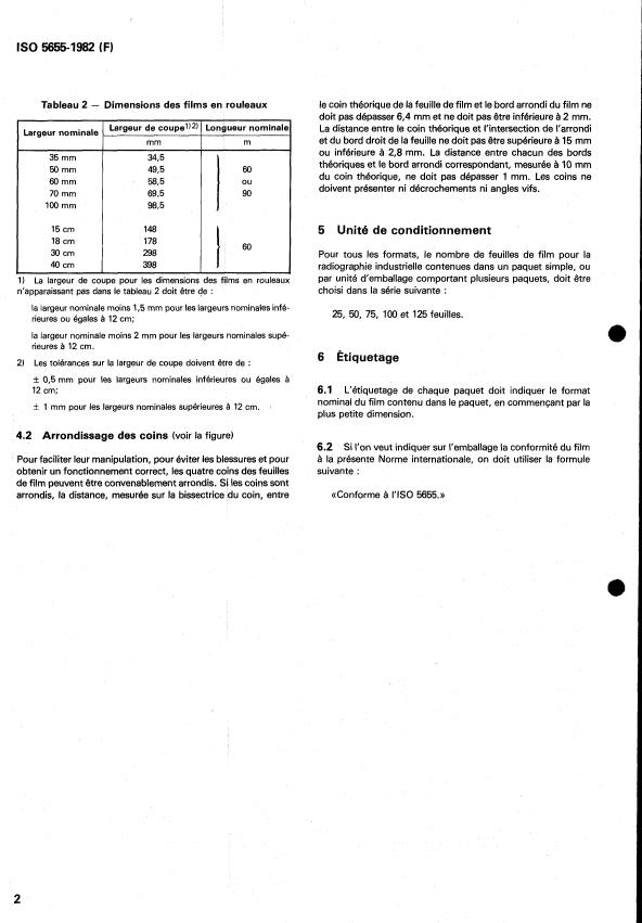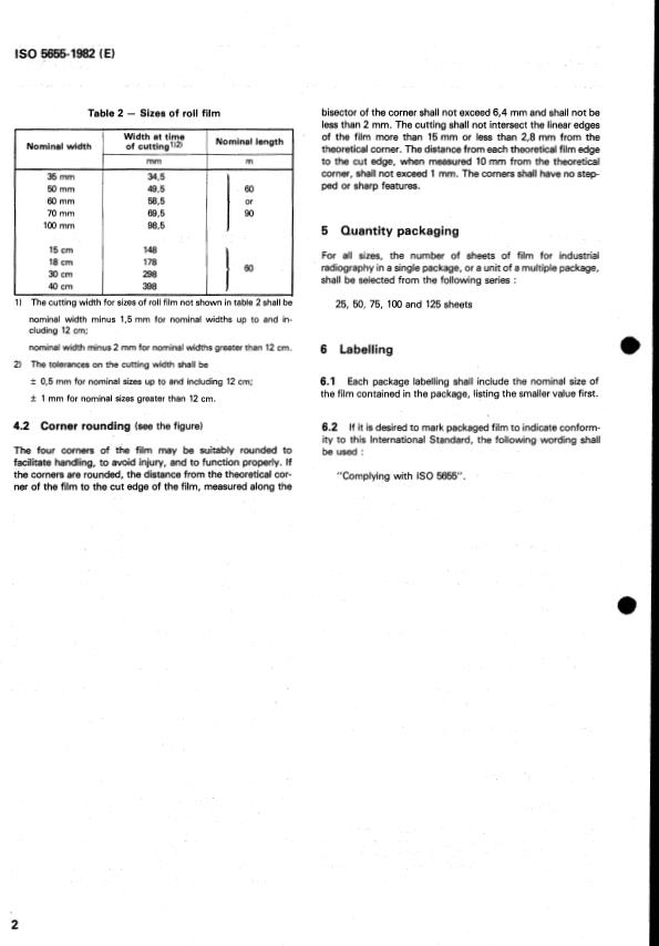 ISO 5655:1982 is a standard published by the International Organization for Standardization (ISO). Its full title is "Photography — Film for industrial radiography — Sizes, quantity packaging and labelling". This standard covers: Photography — Film for industrial radiography — Sizes, quantity packaging and labelling