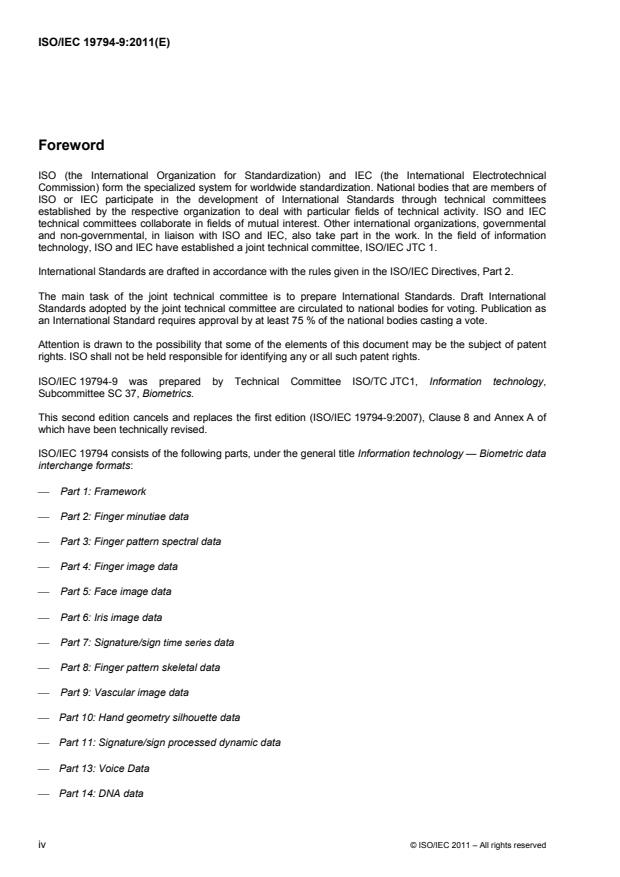ISO/IEC 19794-9:2011 is a standard published by the International Organization for Standardization (ISO). Its full title is "Information technology - Biometric data interchange formats - Part 9: Vascular image data". This standard covers: ISO/IEC 19794-9:2011 specifies an image interchange format for biometric person identification or verification technologies that utilize human vascular biometric images and can be used for the exchange and comparison of vascular image data. It specifies a data record interchange format for storing, recording, and transmitting vascular biometric information from one or more areas of the human body. It defines the contents, format, and units of measurement for the image exchange. The format consists of mandatory and optional items, including scanning parameters, compressed or uncompressed image specifications and vendor-specific information. Information compiled and formatted in accordance with ISO/IEC 19794-9:2011 can be recorded on machine-readable media or can be transmitted by data communication facilities.