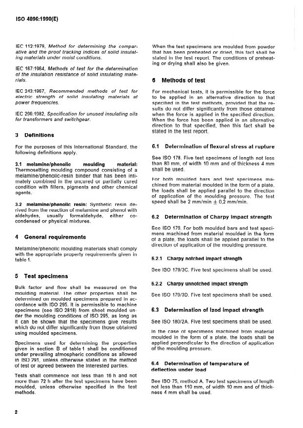 ISO 4896:1990 is a standard published by the International Organization for Standardization (ISO). Its full title is "Plastics — Melamine/phenolic moulding materials — Specification". This standard covers: Specifies requirements for two types of melamine/phenolic moulding materials, i.e. type MPF A: general purpose, and type MPF C: heat-resistant. These types are further subdivided in 5 grades which are differing from each other in the fillers used and in several property values. They are specified in a table with their maximum or minimum property requirements.
