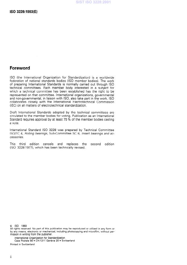 ISO 3228:1993 is a standard published by the International Organization for Standardization (ISO). Its full title is "Rolling bearings — Cast and pressed housings for insert bearings". This standard covers: Specifies boundary dimensions and tolerances for cast and pressed housings for insert bearings for which boundary dimensions are given in ISO 9628. Applies to plummer block housings, flanged housings and take-up housings. The inclusion of relubrication features is optional.