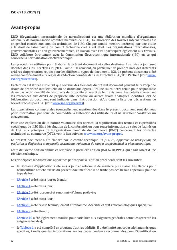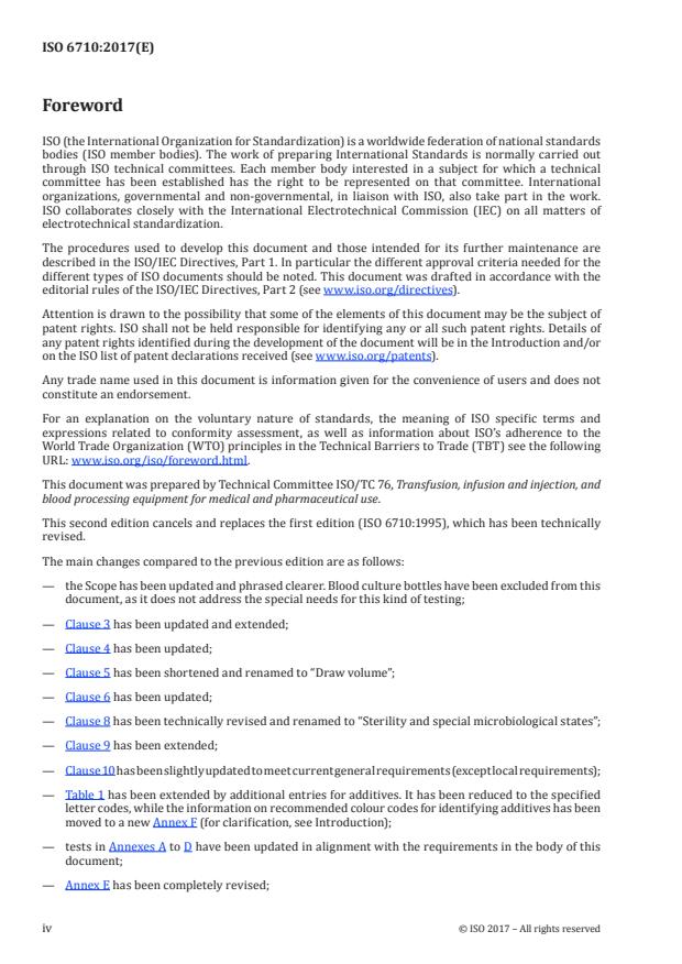 L'ISO 6710 :2017 spécifie les exigences et les méthodes d'essai relatives aux récipients à usage unique pour prélèvements de sang veineux, sous vide ou non. Il ne spécifie pas les exigences relatives aux aiguilles de prélèvement sanguin, aux supports d'aiguille, aux récipients pour hémoculture ou aux dispositifs de prélèvement de gaz du sang «artériel» pouvant aussi être utilisés pour le sang veineux.