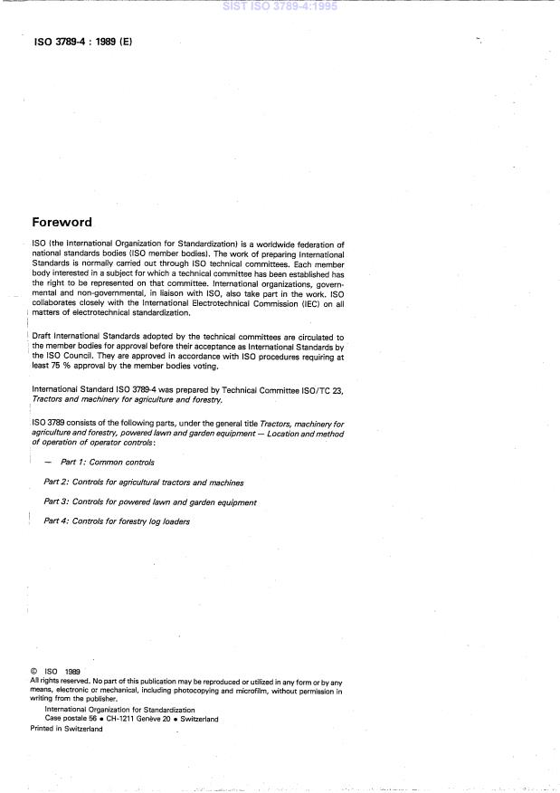 ISO 3789-4:1989 is a standard published by the International Organization for Standardization (ISO). Its full title is "Tractors, machinery for agriculture and forestry, powered lawn and garden equipment — Location and method of operation of operator controls — Part 4: Controls for forestry log loaders". This standard covers: Tractors, machinery for agriculture and forestry, powered lawn and garden equipment — Location and method of operation of operator controls — Part 4: Controls for forestry log loaders