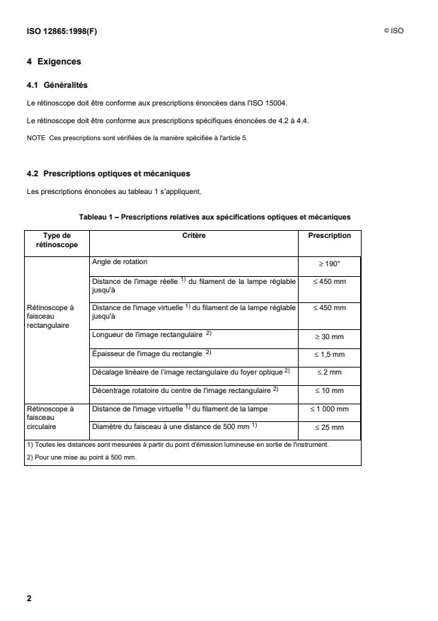 Tableau 1 – Prescriptions relatives aux spécifications optiques et mécaniques