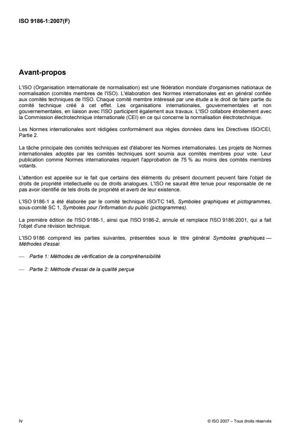 L'ISO 9186-1:2007 spécifie des méthodes permettant de vérifier la compréhensibilité et la compréhension des symboles graphiques. Elle comprend la méthode à utiliser pour évaluer la portée d'un message communiqué par une variante d'un symbole graphique, et la méthode d'essai à utiliser pour déterminer quelle est la variante d'un symbole graphique estimée la plus compréhensible. L'ISO 9186-1:2007 a pour objet de garantir que les symboles graphiques, ainsi que les signaux de sécurité utilisant ces symboles, sont faciles à comprendre. Elle vise à mettre au point des symboles graphiques qui soient compris correctement par les utilisateurs sans recours à un texte (explicatif) complémentaire. Si cela n'est pas possible, il peut être nécessaire d'associer au symbole graphique un texte expliquant le sens du symbole dans la langue de l'utilisateur potentiel.