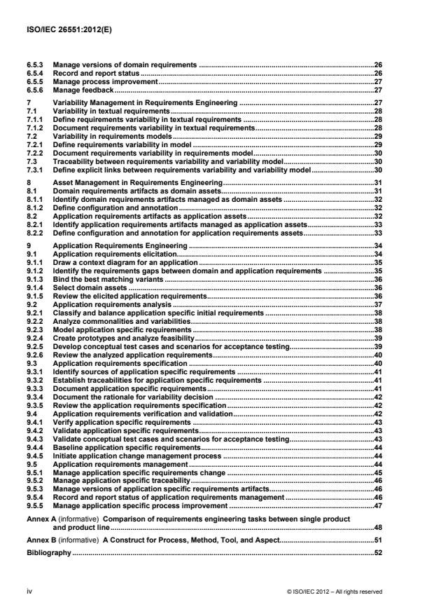 ISO/IEC 26551:2012 provides the capabilities of tools and methods that support Software and Systems Product Line (SSPL) requirements engineering. In SSPL requirements engineering, there are three core processes: Product Line scoping, Domain Requirements Engineering, and Application Requirements Engineering. The major purpose of Product Line Scoping estimates the costs and benefits of a product line, and thereby lets an organization make a go/no-go decision.The costs and benefits estimation results play a pivotal role as an indicator for assessing the effectiveness and efficiency of a product line. The major purpose of the Domain Requirements Engineering is to analyze commonality and variability for the product line based on the initial features defined in Product Line Scoping, where the major purpose of the Application Requirements Engineering is to define application requirements based on domain requirements assets by reusing, selecting, or newly adding application specific requirements. For producing multiple products in a product line, the above processes need to be adequately integrated centered around core assets, which is causing the management of domain/application requirements complexities. Thus, the proper supports of methods and tools are essential, and the product line specific capabilities of methods and tools have to be defined. ISO/IEC 26551:2012 can be used in the following modes: - By the users: to benefit people who develop, operate, and manage requirements engineering for software and systems product lines. - By a product line organization: to provide guidance in the evaluation and selection for tools and methods for product line requirements engineering. - By providers of tools and methods: to provide guidance in implementing or developing tools and methods by providing a comprehensive set of the capabilities of tools and methods for product line requirements engineering.