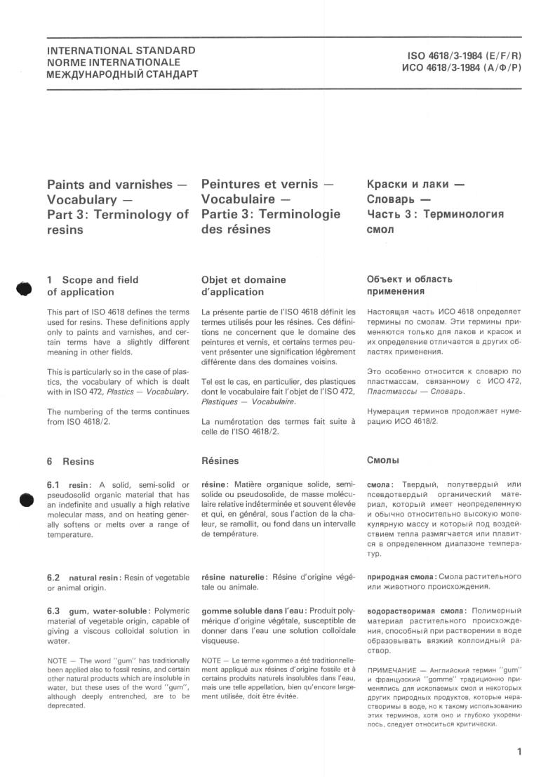 ISO 4618-3:1984 is a standard published by the International Organization for Standardization (ISO). Its full title is "Paints and varnishes — Vocabulary — Part 3: Terminology of resins". This standard covers: Paints and varnishes — Vocabulary — Part 3: Terminology of resins