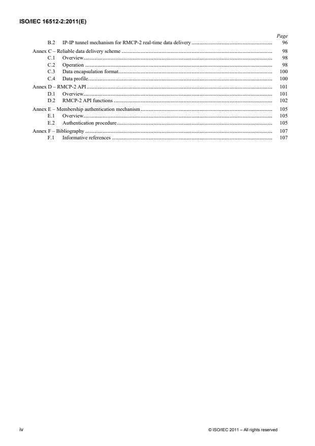 ISO/IEC 16512-2:2011 is a standard published by the International Organization for Standardization (ISO). Its full title is "Information technology — Relayed multicast protocol: Specification for simplex group applications — Part 2:". This standard covers: ISO/IEC 16512-2:2011 specifies the relayed multicast protocol for simplex group applications (RMCP-2), an application-layer protocol, which constructs a multicast tree for data delivery from one sender to multiple receivers over the Internet where IP multicast is not fully deployed. It defines a basic RMCP-2 protocol without security features, and a secure RMCP-2 protocol that adds security features to the basic protocol. Both protocols specify a series of functions and procedures for multicast agents to construct a one-to-many relayed data path and to relay simplex data. They also specify the operations of the session manager to manage multicast sessions. These protocols can be used for applications that require one-to-many data delivery services, such as multimedia streaming services or file dissemination services. ISO/IEC 16512-2:2011 also defines a membership authentication procedure for use with the secure RMCP-2 protocol and provides informative material related to the protocols.