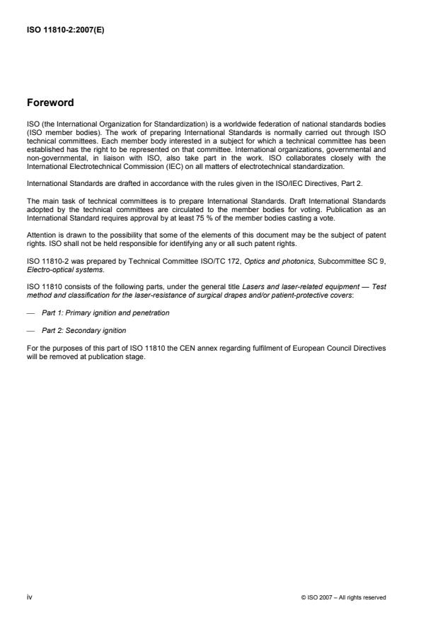 ISO 11810-2:2007 is a standard published by the International Organization for Standardization (ISO). Its full title is "Lasers and laser-related equipment — Test method and classification for the laser-resistance of surgical drapes and/or patient-protective covers — Part 2: Secondary ignition". This standard covers: ISO 11810-2:2007 is applicable to disposable and re-usable, as well as woven and non-woven materials used as surgical drapes and/or patient protective covers which claim to be laser-resistant. The purpose of ISO 11810-2:2007 is to provide a standardized method for testing and classifying surgical drapes and/or patient protective covers with respect to laser-induced hazards. An appropriate classification system is given. It is not the purpose of ISO 11810-2:2007 to serve as a general fire safety specification. ISO 11810-2:2007 is limited to testing the secondary ignition of materials that are rated I1 or I2 from ISO 11810-1. All materials reflect portions of the beam and it is necessary for the user to decide whether specular reflection may be a hazard. This measurement, however, is not covered in ISO 11810-2:2007.