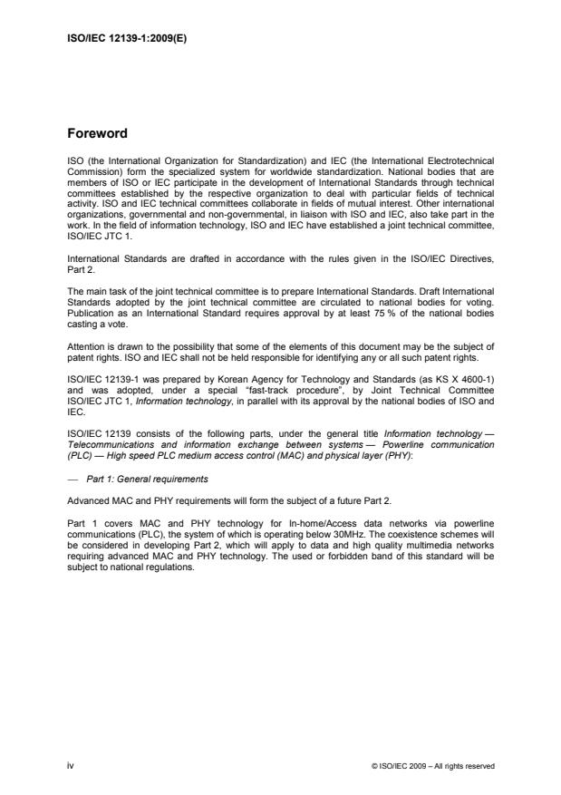 ISO/IEC 12139-1:2009 is a physical and medium access control layer specification with respect to the connectivity for In-home and Access network high speed powerline communication stations. ISO/IEC 12139-1:2009 provides functional requirements and specification of the physical and medium access control layer for high speed powerline communication devices, and does not include specific implementation methods.