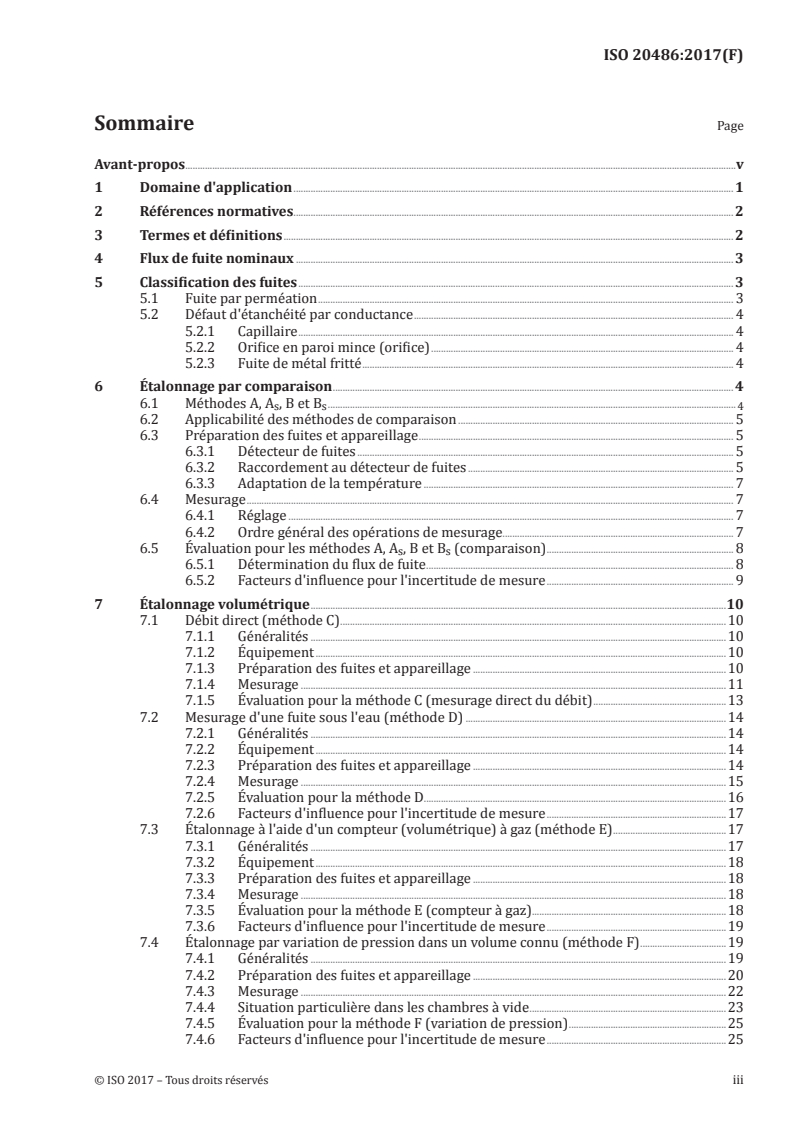 ISO 20486:2017 spécifie l'étalonnage des fuites utilisées dans le réglage des détecteurs de fuites et la détermination des flux de fuite, dans le cadre d'un usage quotidien. Un type de méthode d'étalonnage est une comparaison avec une fuite de référence. Ainsi, les fuites faisant l'objet d'un usage courant deviennent traçables par rapport à un étalon primaire. Dans d'autres méthodes d'étalonnage, la valeur de la pression de vapeur était mesurée directement ou calculée sur un volume connu. Les modes opératoires d'étalonnage par comparaison sont de préférence applicables aux fuites d'hélium, car ce gaz d'essai peut être mesuré individuellement au moyen d'un détecteur de fuites à spectromètre de masse (DFSM) (la définition de DFSM est donnée dans l'ISO 20484). L'étalonnage par comparaison (voir méthodes A, As, B et Bs ci-dessous) qui utilise des fuites de référence connues est facilement applicable aux fuites de réservoir et à celles dont les flux de fuite sont inférieurs à 10−7 Pa·m3/s.