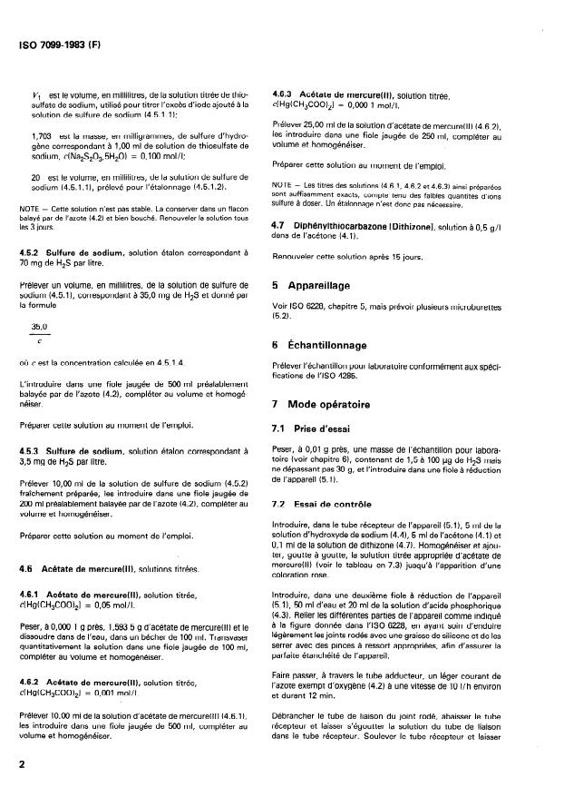 ISO 7099:1983 is a standard published by the International Organization for Standardization (ISO). Its full title is "Phosphoric acid for industrial use (including foodstuffs) — Determination of hydrogen sulfide content — Titrimetric method". This standard covers: The hydrogen sulphide in a test portion is removed in a stream of nitrogen and absorbed in a solution of sodiumhydroxide in aqueous acetone. the sulphide ions are titrated with standard volumetric mercury(II) acetate solution, in the presence of 1,5-diphenylthiocarbazone (dithizone) as indicator. The method is applicable to products having hydrogen sulfide contents greater than or equal to 0.05 mg/kg.