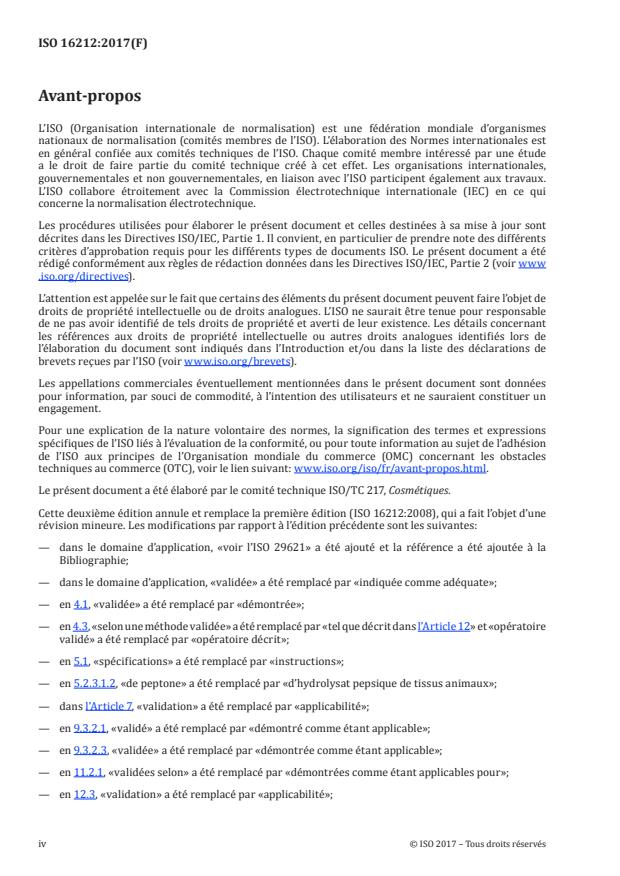 L'ISO 16212:2017 donne des lignes directrices générales pour le dénombrement des levures et des moisissures présentes dans les cosmétiques par dénombrement des colonies en milieu gélosé sélectif après une incubation aérobie. Pour garantir la qualité du produit et la sécurité des consommateurs, il est conseillé d'effectuer une analyse de risque microbiologique appropriée, afin de déterminer les types de produits cosmétiques qui relèvent de l'ISO 16212:2017. Les produits considérés comme présentant un faible risque microbiologique (voir l'ISO 29621) comprennent ceux ayant une faible activité de l'eau ou des valeurs de pH extrêmes, les produits hydro-alcooliques, etc. En raison de la grande variété de produits cosmétiques entrant dans ce domaine d'application, la présente méthode pourrait ne pas être applicable en tout point à certains produits (par exemple à certains produits non miscibles à l'eau). Il est possible de remplacer les essais présentés ici par d'autres méthodes (par exemple des méthodes automatisées) sous réserve que leur équivalence ait été démontrée ou que la méthode ait été par ailleurs indiquée comme adéquate. Les levures dénombrées peuvent être identifiées à l'aide d'essais d'identification appropriés, par exemple ceux décrits dans les normes indiquées dans la Bibliographie. Les moisissures dénombrées peuvent être identifiées en utilisant d'autres méthodes appropriées, si nécessaire.