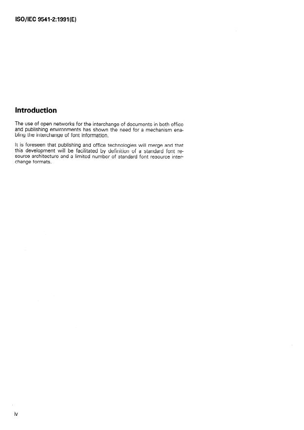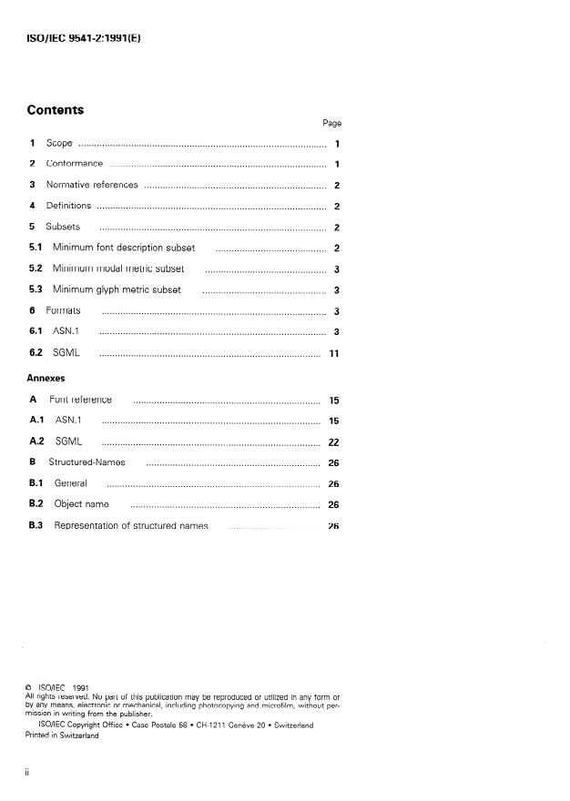 ISO/IEC 9541-2:1991 is a standard published by the International Organization for Standardization (ISO). Its full title is "Information technology — Font information interchange — Part 2: Interchange format". This standard covers: This part requires the property definitions as defined in Part 1. Annexes A (ASN.1 and SGML) and B (Structured-Names) form an integral part of this standard.