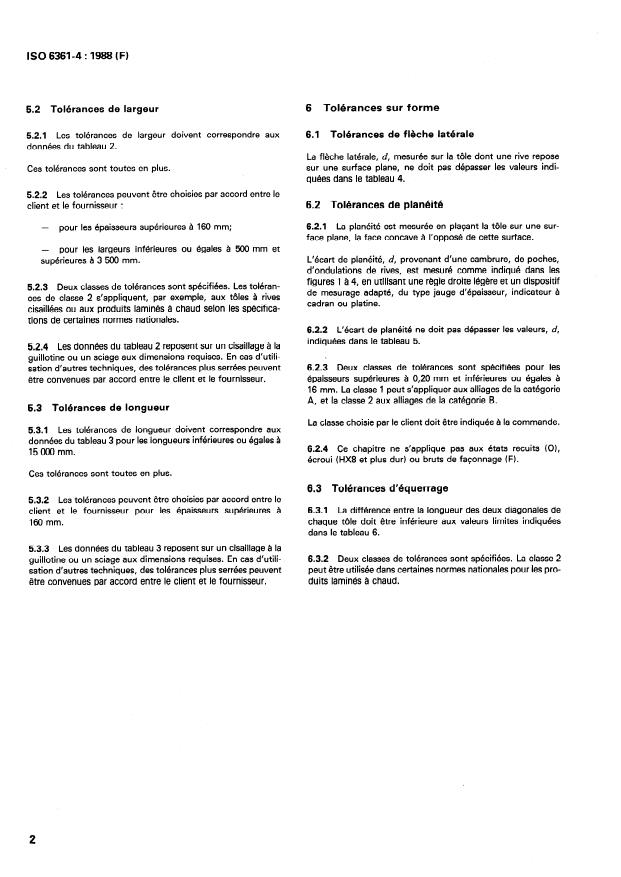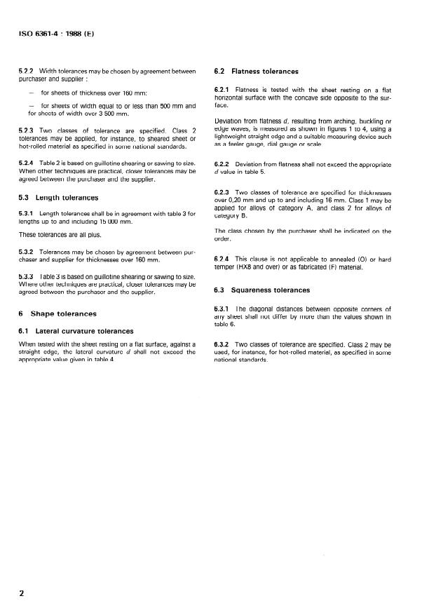 ISO 6361-4:1988 is a standard published by the International Organization for Standardization (ISO). Its full title is "Wrought aluminium and aluminium alloy sheets, strips and plates — Part 4: Sheets and plates — Tolerances on form and dimensions". This standard covers: This part of ISO 6361 specifies the tolerances on thickness, width, length, lateral curvature, flatness and squareness for sheet, according to the definition in ISO 3134-3.