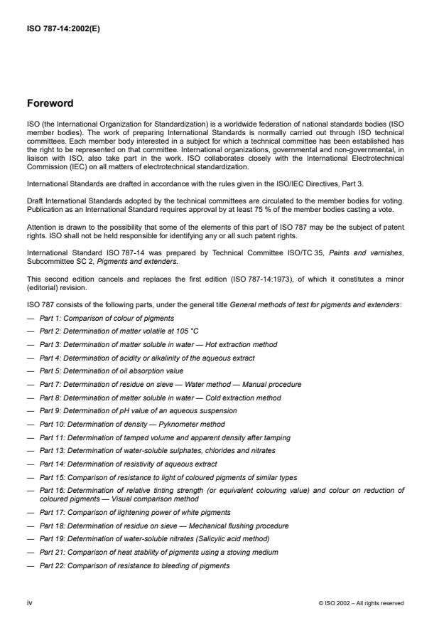 ISO 787-14:2002 is a standard published by the International Organization for Standardization (ISO). Its full title is "General methods of test for pigments and extenders — Part 14: Determination of resistivity of aqueous extract". This standard covers: This part of ISO 787 specifies a general method of test for determining the resistivity (specific resistance) of the aqueous extract of a pigment. The method is applicable to all pigments and extenders, except pigments that are substantially soluble in water.