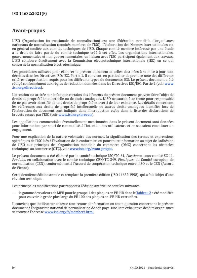 — la gamme des valeurs de MFR pour le groupe 1 des plaques en PE-HD dans le Tableau 2 a été modifiée
