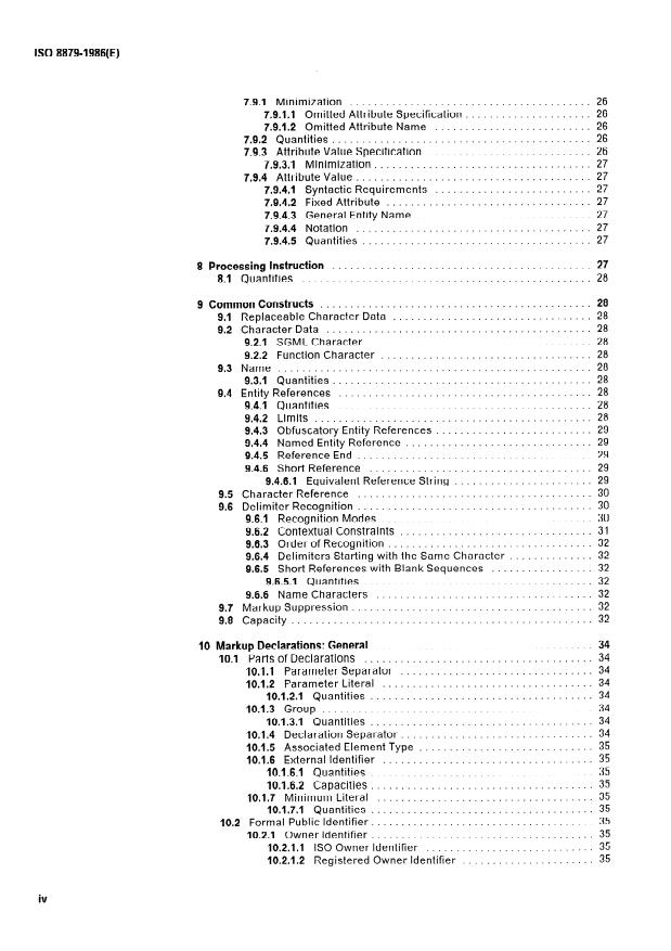 - Conformance and validation - definitions of conforming SGML documents, applications and systems, plus requirements for validating SGML parsers and error reporting.