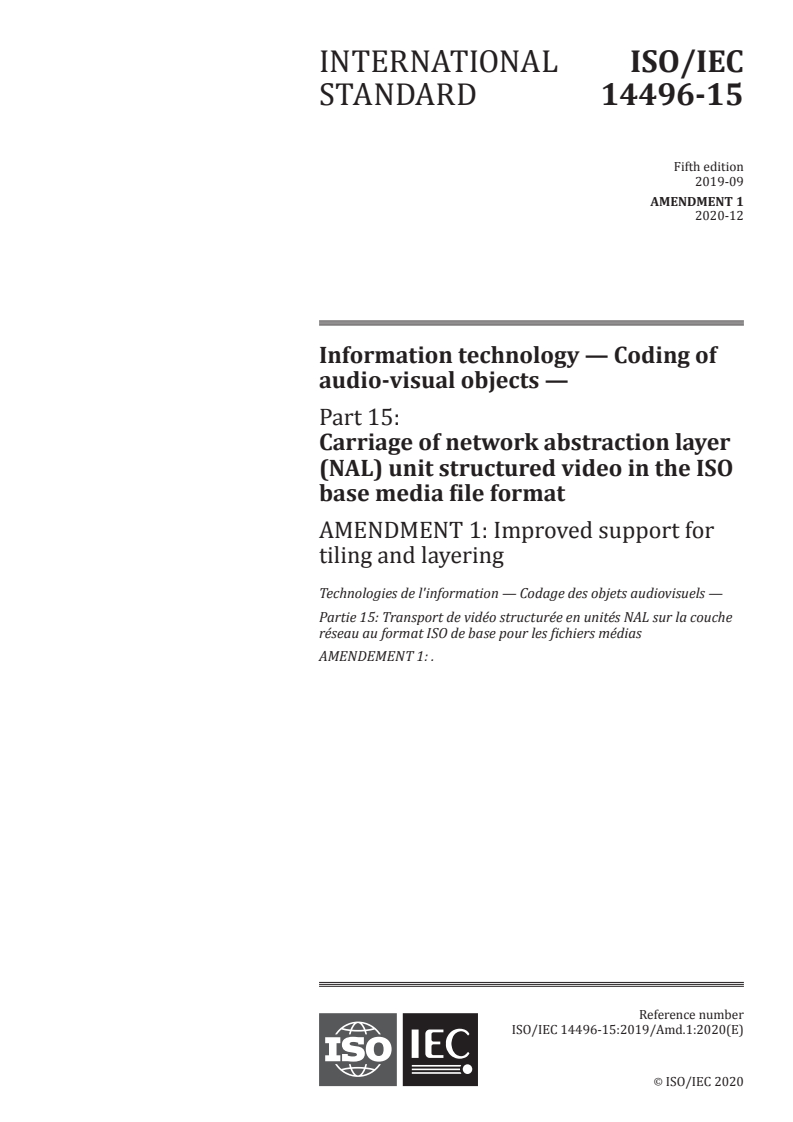 ISO/IEC 14496-15:2019/Amd 1:2020 - Information technology — Coding of audio-visual objects — Part 15: Carriage of network abstraction layer (NAL) unit structured video in the ISO base media file format — Amendment 1: Improved support for tiling and layering Released:12/7/2020