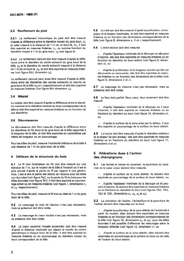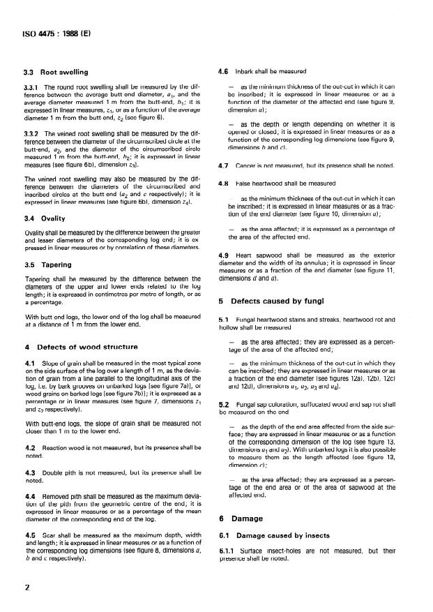 ISO 4475:1989 specifies standardized methods for measuring visible defects in coniferous and broadleaved tree sawlogs. It defines how to quantify defects such as knots, shakes, curvature, root swellings, ovality, sapwood/heartwood anomalies, fungal damage, char and mechanical damage. The standard cross‑references ISO 4473 (classification) and ISO 4474 (terms and definitions) and includes illustrated examples (13 figures). Where linear measurement is specified, values are in whole centimetres rounded down to the nearest centimetre.