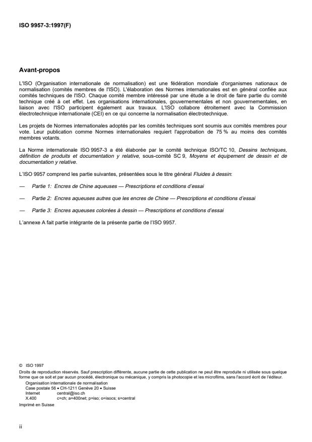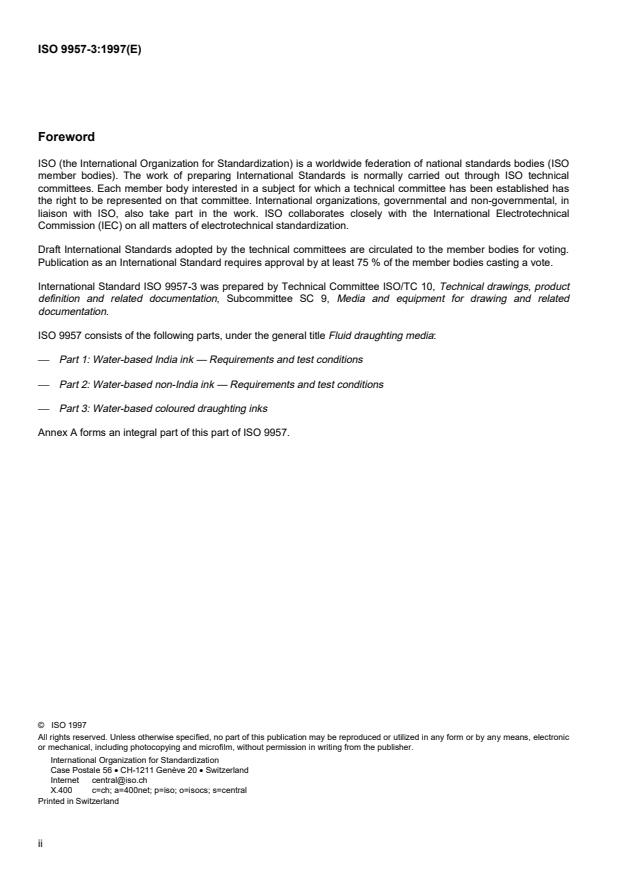 ISO 9957-3:1997 is a standard published by the International Organization for Standardization (ISO). Its full title is "Fluid draughting media — Part 3: Water-based coloured draughting inks — Requirements and test conditions". This standard covers: Fluid draughting media — Part 3: Water-based coloured draughting inks — Requirements and test conditions