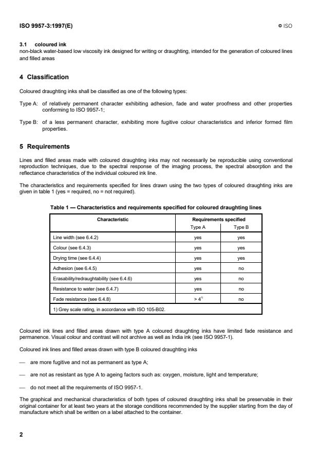 Keywords: ISO 9957-3, water-based coloured draughting inks, technical pens, tracing paper, line width, drying time, adhesion, fade resistance, testing conditions.