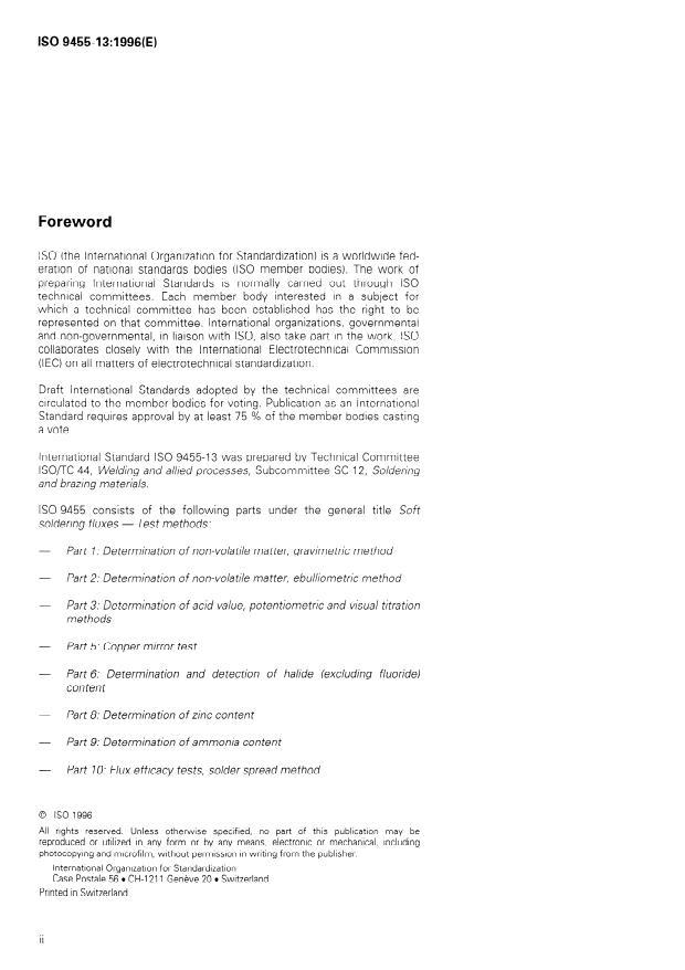 ISO 9455-13:1996 is a standard published by the International Organization for Standardization (ISO). Its full title is "Soft soldering fluxes — Test methods — Part 13: Determination of flux spattering". This standard covers: Describes a method for estimating the tendency of a flux to spatter in use. It is a qualitative (comparative) method and is only applicable to liquid fluxes, as defined in ISO 9454-1.