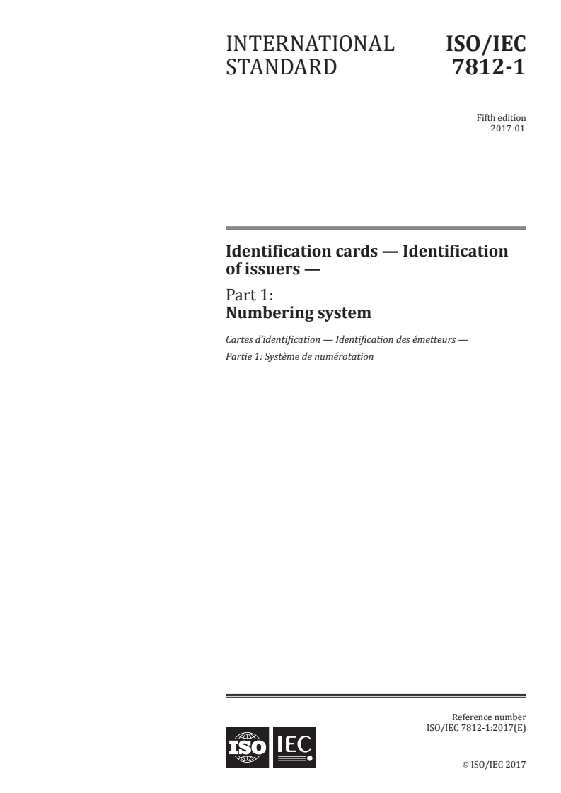 ISO/IEC 7812-1:2017 is a standard published by the International Organization for Standardization (ISO). Its full title is "Identification cards - Identification of issuers - Part 1: Numbering system". This standard covers: ISO/IEC 7812-1:2017 specifies a numbering system for the identification of the card issuers, the format of the issuer identification number (IIN) and the primary account number (PAN).