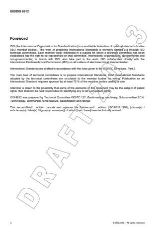 ISO 8812:2016 is a standard published by the International Organization for Standardization (ISO). Its full title is "Earth-moving machinery - Backhoe loaders - Terminology and commercial specifications". This standard covers: ISO 8812:2016 establishes terminology and the content of commercial literature specifications for self-propelled crawler or wheeled backhoe loaders, as defined in ISO 6165, and their equipment. ISO 8812:2016 is not applicable to loaders equipped with a backhoe attachment in accordance with ISO 7131:2009, 3.3.1.1.