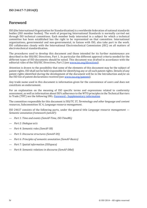 ISO 24617-7:2014 is a standard published by the International Organization for Standardization (ISO). Its full title is "Language resource management — Semantic annotation framework — Part 7: Spatial information (ISOspace)". This standard covers: ISO 24617-7:2014 provides a framework for encoding a broad range not only of spatial information, but also of spatiotemporal information relating to motion as expressed in natural language texts. It includes references to locations, general spatial entities, spatial relations (involving topological, orientational, and metric values), dimensional information, motion events, and paths.