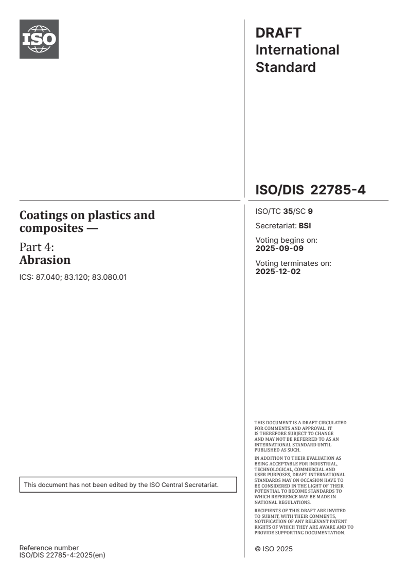 ISO/FDIS 22785-4 - Paints and varnishes — Coatings on plastics and composites — Part 4: Abrasion/15/2025