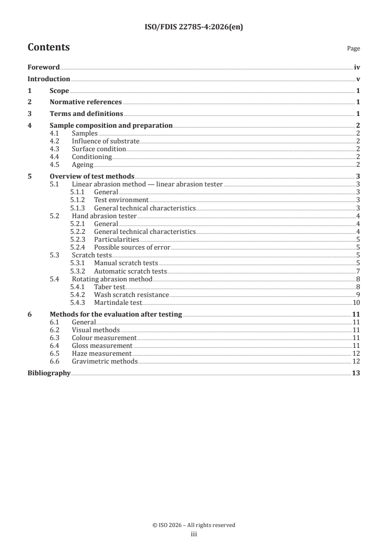 ISO/FDIS 22785-4 is a draft published by the International Organization for Standardization (ISO). Its full title is "Paints and varnishes — Coatings on plastics and composites — Part 4: Abrasion and scratch testing". This standard covers: This document gives an overview on the abrasion and scratch tests of coatings on plastics, plastics composites, and similar substrates, hereinafter collectively referred to under the term plastics. Characteristics and differences to metallic substrates of plastics are explained, as well as their effect on the behaviour of the coating during the abrasion and scratch tests is taken into consideration.