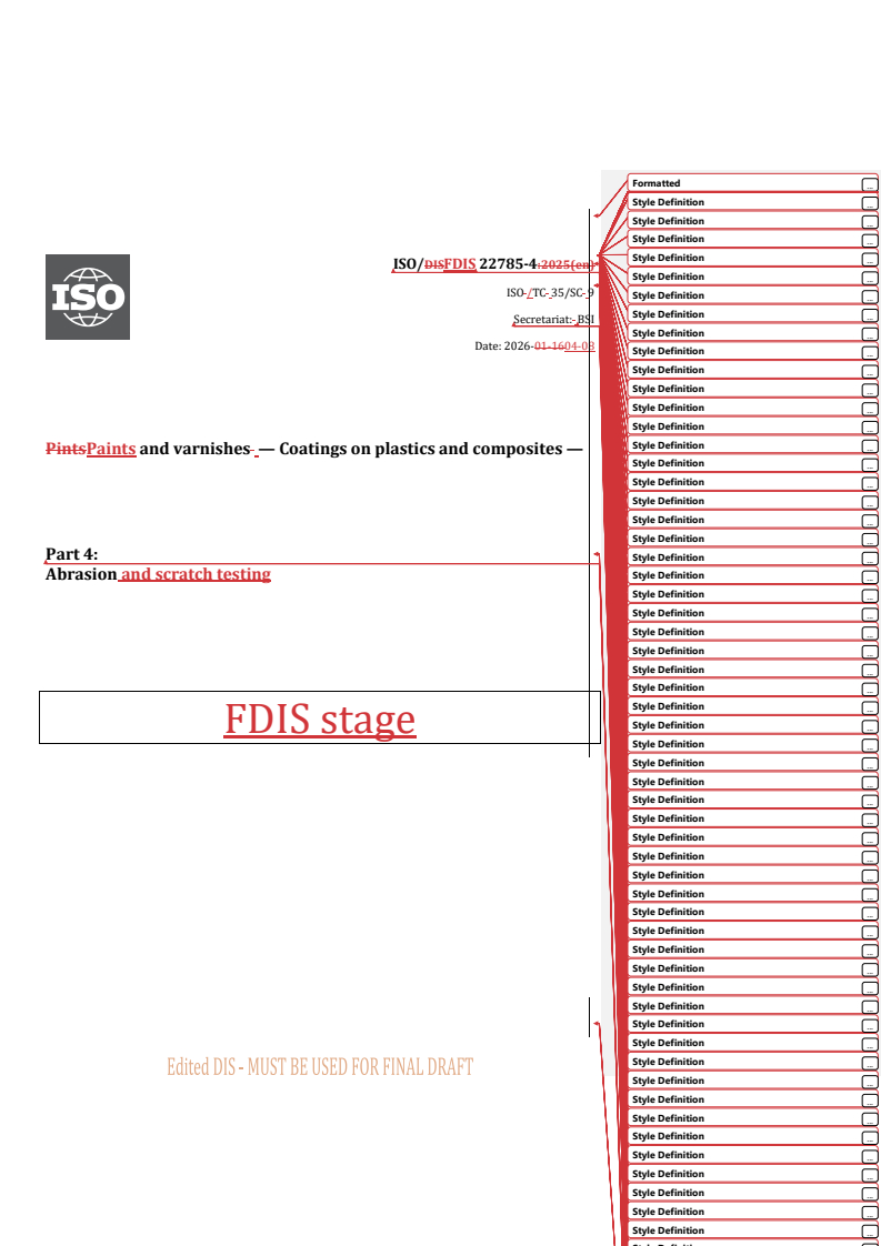 REDLINE ISO/FDIS 22785-4 - Paints and varnishes — Coatings on plastics and composites — Part 4: Abrasion and scratch testing