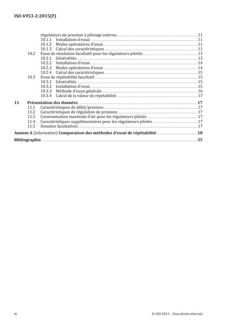 ISO 6953-2:2015 is a standard published by the International Organization for Standardization (ISO). Its full title is "Pneumatic fluid power - Compressed air pressure regulators and filter-regulators - Part 2: Test methods to determine the main characteristics to be included in literature from suppliers". This standard covers: ISO 6953-2:2015 specifies test procedures and a method of presenting the results concerning the parameters which define the main characteristics to be included in literature from suppliers of regulators and filter-regulators conforming to ISO 6953‑1. The purpose of this part of ISO 6953 is the following: - to facilitate the comparison of pressure regulators and filter-regulators by standardizing test methods and presentation of test data; - to assist in the proper application of pressure regulators and filter-regulators in compressed air systems. The tests specified are intended to allow comparison among the different type of regulators and filter-regulators; they are not production tests to be carried out on each pressure regulator or filter-regulator manufactured. NOTE 1 The tests related to electro-pneumatic pressure control valves are specified in ISO 10094−2. NOTE 2 Use ISO 6953‑3 for an alternative dynamic test method for flow-rate characteristics using an isothermal tank instead of a flow meter. However, this method measures only the decreasing flow rate part of the hysteresis curve of forward flow and relief flow characteristics.