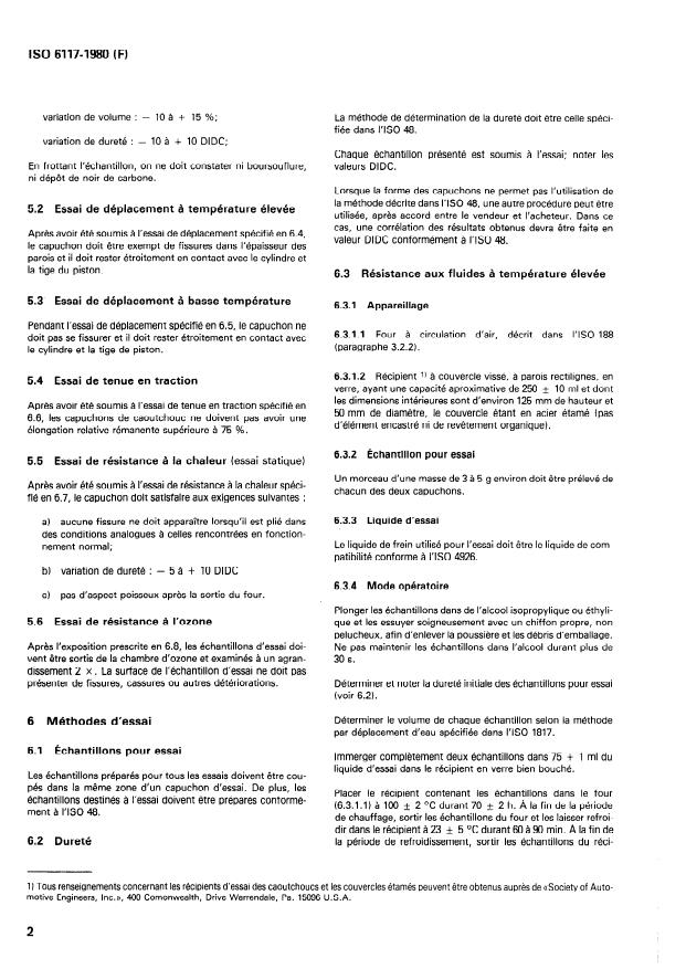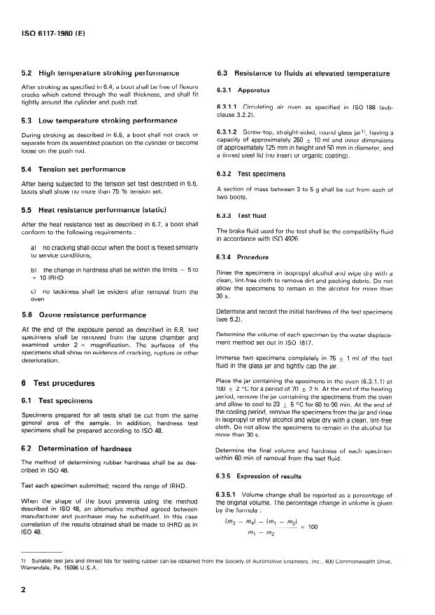 ISO 6117:1980 is a standard published by the International Organization for Standardization (ISO). Its full title is "Road vehicles — Elastomeric boots for drum type hydraulic brake wheel cylinders using a non-petroleum base hydraulic brake fluid (service temperature 100 degrees C max.)". This standard covers: Specifies performance tests for moulded rubber boots used as end closures on drum type brake cylinders. These boots prevent the entrance of dirt and moisture which could cause corrosion and otherwise impair wheel brake operation. Applies to boots of both plain and reinforcement insert types. Requirements relating to chemical composition, tensile strength or elongation at break of the rubber compound are not included.