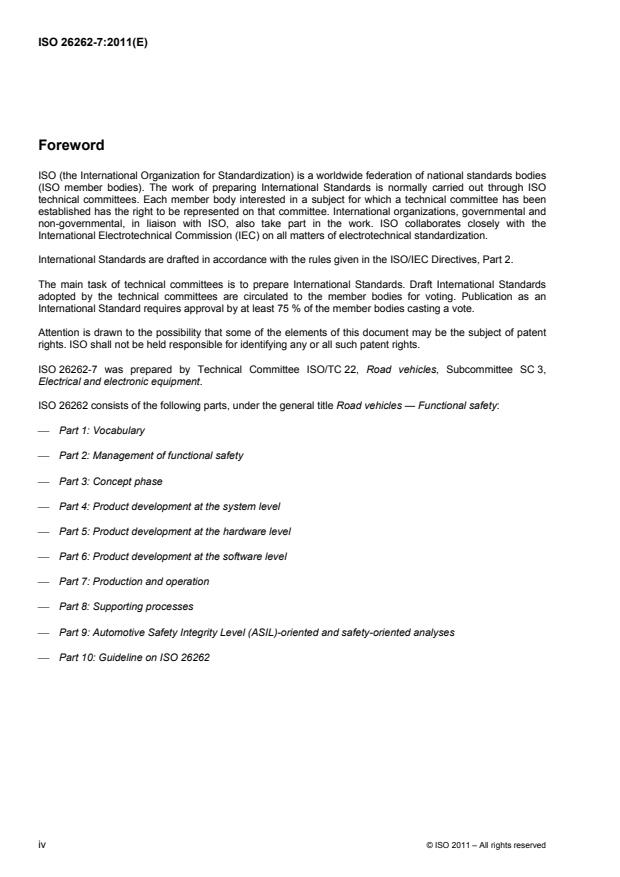 ISO 26262-7:2011 is a standard published by the International Organization for Standardization (ISO). Its full title is "Road vehicles — Functional safety — Part 7: Production and operation". This standard covers: ISO 26262 is intended to be applied to safety-related systems that include one or more electrical and/or electronic (E/E) systems and that are installed in series production passenger cars with a maximum gross vehicle mass up to 3 500 kg. ISO 26262 does not address unique E/E systems in special purpose vehicles such as vehicles designed for drivers with disabilities. Systems and their components released for production, or systems and their components already under development prior to the publication date of ISO 26262, are exempted from the scope. For further development or alterations based on systems and their components released for production prior to the publication of ISO 26262, only the modifications will be developed in accordance with ISO 26262. ISO 26262 addresses possible hazards caused by malfunctioning behaviour of E/E safety-related systems, including interaction of these systems. It does not address hazards related to electric shock, fire, smoke, heat, radiation, toxicity, flammability, reactivity, corrosion, release of energy and similar hazards, unless directly caused by malfunctioning behaviour of E/E safety-related systems. ISO 26262 does not address the nominal performance of E/E systems, even if dedicated functional performance standards exist for these systems (e.g. active and passive safety systems, brake systems, Adaptive Cruise Control). ISO 26262-7:2011 specifies the requirements for production, operation, service and decommissioning.