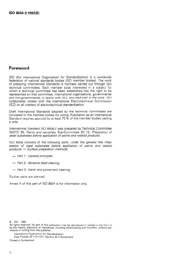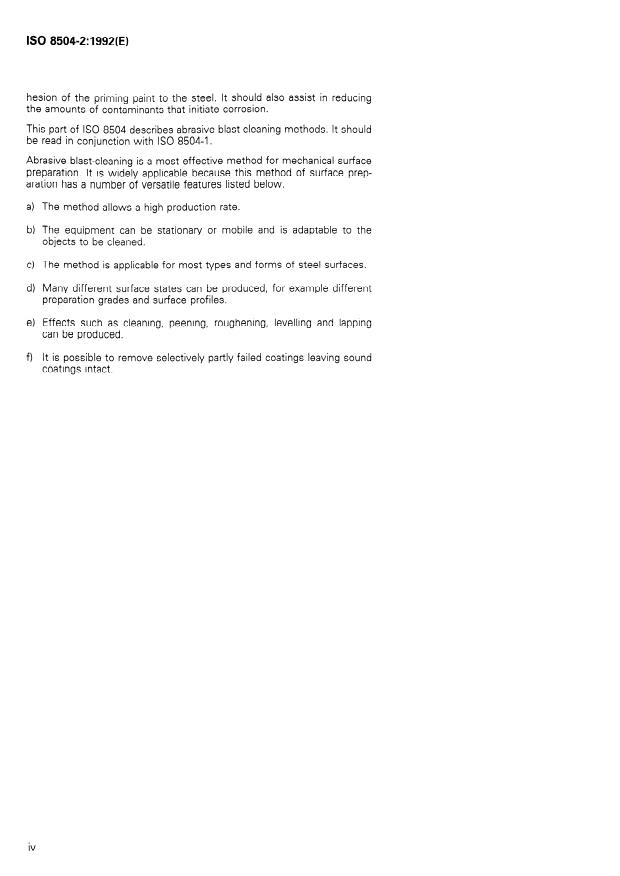 ISO 8504-2:1992 is a standard published by the International Organization for Standardization (ISO). Its full title is "Preparation of steel substrates before application of paints and related products — Surface preparation methods — Part 2: Abrasive blast-cleaning". This standard covers: Preparation of steel substrates before application of paints and related products — Surface preparation methods — Part 2: Abrasive blast-cleaning