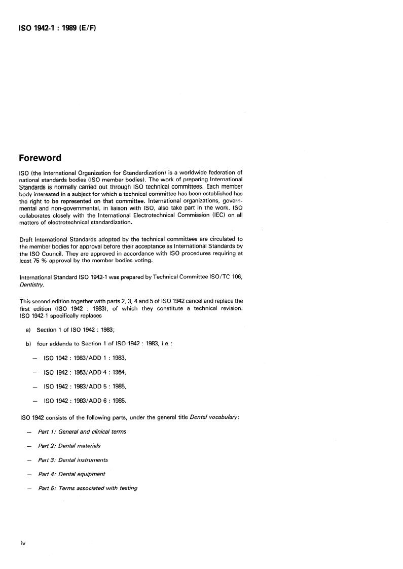 ISO 1942-1:1989 is a standard published by the International Organization for Standardization (ISO). Its full title is "Dental vocabulary — Part 1: General and clinical terms". This standard covers: This standard is intended to provide accepted definitions for a number of terms used in dentistry that could prove useful for the comprehension of documents and to improve communication. It defines 130 general and clinical terms. Together with the other four parts it constitutes a technical revision of the first edition of this standard.