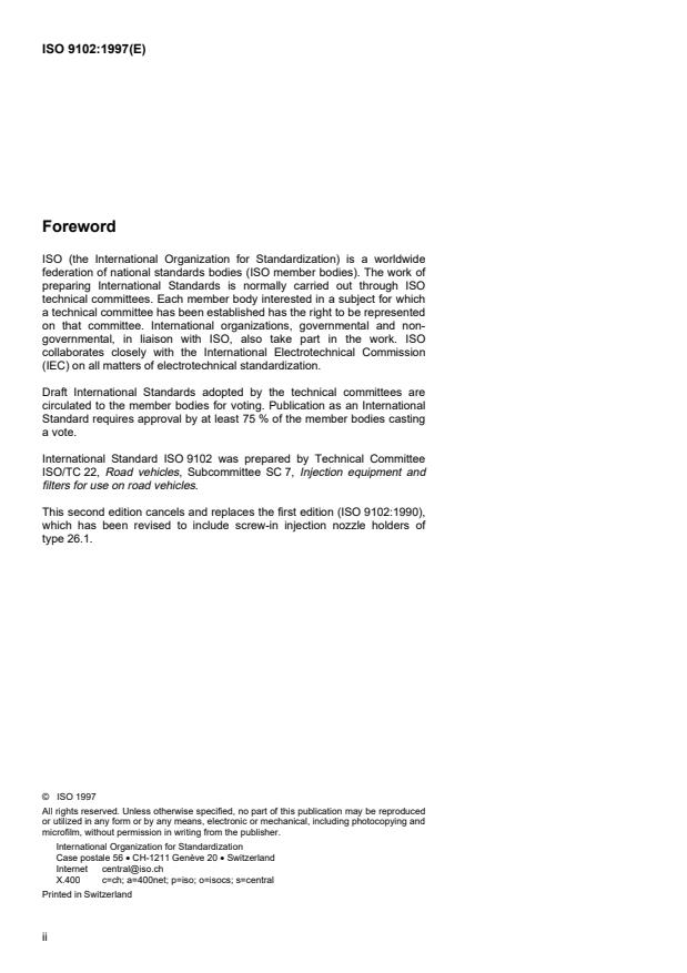 ISO 9102:1997 is a standard published by the International Organization for Standardization (ISO). Its full title is "Diesel engines — Screw-in injection nozzle holders, types 24, 25, 26 and 26.1". This standard covers: Diesel engines — Screw-in injection nozzle holders, types 24, 25, 26 and 26.1