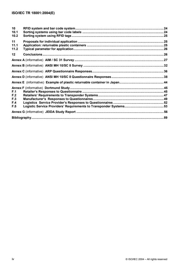 ISO/IEC TR 18001:2004 is a technical report published by the International Organization for Standardization (ISO). Its full title is "Information technology - Radio frequency identification for item management - Application requirements profiles". This standard covers: ISO/IEC TR 18001:2004 provides: the result of three surveys identifying the applications for radio frequency identification (RFID) in an item management environment, and the resultant classification of these applications based on various operational parameters, including operating range and memory size; an explanation of some of the issues associated with the parameters of distance and number of tags within an RFID interrogator's field-of-view; a means by which classification of RF tags may be accomplished based on the application requirements defined in the survey results; recommendations for areas of standardization to the parent committee (ISO/IEC JTC 1/SC 31/WG 4) based on the results of these surveys.