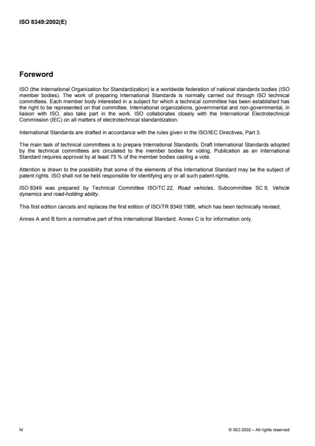 ISO 8349:2002 is a standard published by the International Organization for Standardization (ISO). Its full title is "Road vehicles — Measurement of road surface friction". This standard covers: This International Standard specifies test methods for determining the characteristic longitudinal friction force values of paved surfaces using either a standard reference test tyre or the tyre of a vehicle under test. General test procedures and their validity are presented for determining peak- and slide-braking coefficients on actual test surfaces, where the surface conditions are determined and controlled by the user at the time of testing. Test and test-surface condition documentation procedures and details are also specified. The purpose of this International Standard is to provide for the harmonization of results of testing on different test tracks. The values measured with standard reference test tyres (SRTT) are intended to form standard reference numbers indicating the friction properties of test tracks and road surfaces that are representative for passenger car tyres. Certain of the methods may also be suitable for measuring the friction properties for a specific test car tyre on the test track. The values quantify the peak-, near-peak or slide-braking coefficients at the time of test and do not necessarily represent fixed values. The values measured with reference tyres are intended as reference numbers indicating certain friction properties of test tracks and road surfaces. This International Standard does not purport to address all the safety problems associated with its use. It is the responsibility of the user to consult and establish appropriate safety and health practices and determine the applicability of regulatory limitations prior to use. NOTE 1 Friction is affected by many variables such as environmental conditions, usage, age and surface contamination. Measured values will change when any of these conditions significantly changes. NOTE 2 The measured braking coefficient values obtained with the procedures stated in this International Standard may not necessarily agree or correlate directly with those obtained by other surface coefficient measuring methods.
