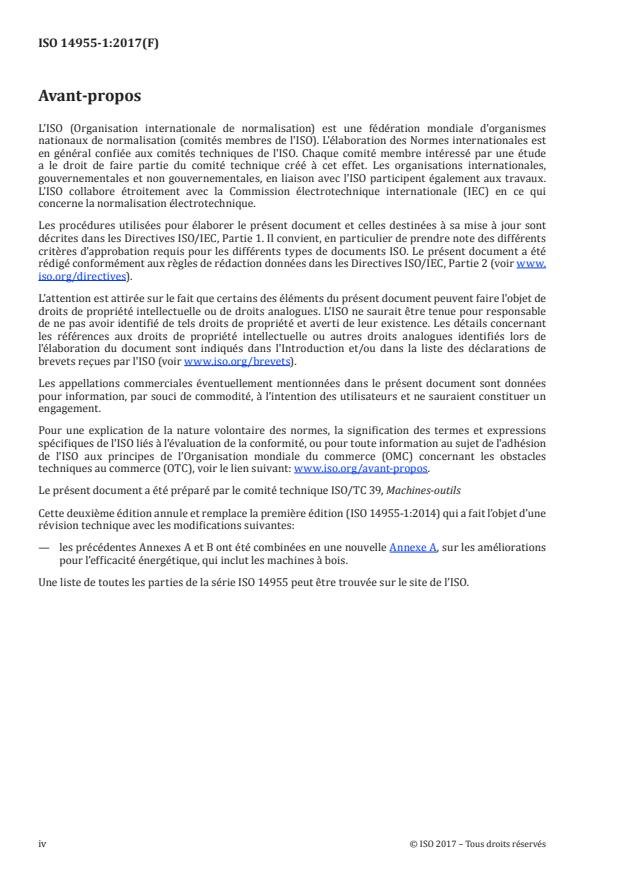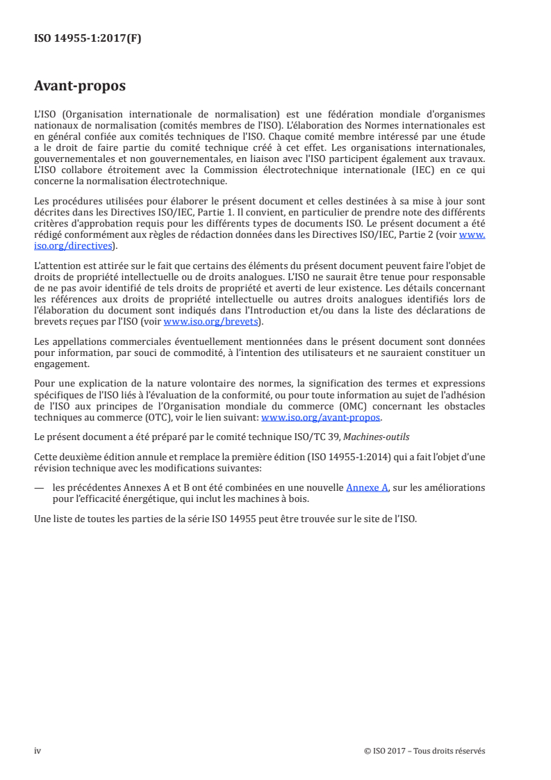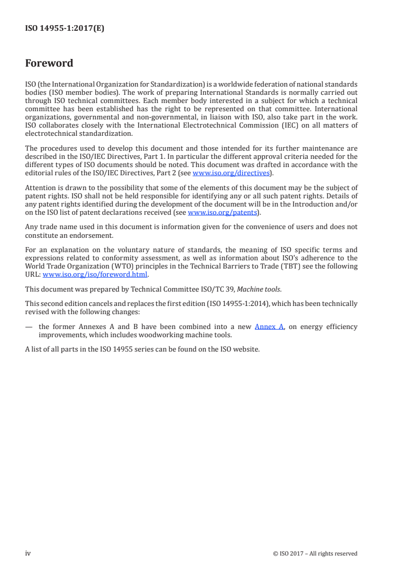 ISO 14955-1:2017 constitutes the application of eco-design standards to machine tools, mainly for automatically operated and/or numerically controlled (NC) machine tools. ISO 14955-1:2017 addresses the energy efficiency of machine tools during the use stage, i.e. the working life of the machine tool. Environmentally relevant stages other than the use stage and relevant impacts other than energy supplied to machine tools are not within the scope and need special treatment (e.g. according to ISO/TR 14062). Elements of eco-design procedure according to ISO/TR 14062 are applied to machine tools. Reporting of results to users and suppliers and monitoring of results are defined. Evaluation of energy efficiency implies quantification of the resources used, i.e. energy supplied, and of the result achieved. ISO 14955-1:2017 provides guidance for a reproducible quantification of the energy supplied. It does not suggest a methodology for quantifying the result achieved due to the lack of universal criteria. The result achieved in industrial application being machined workpieces, their properties (e.g. material, shape, accuracy, surface quality), the constraints of production (e.g. minimum lot size, flexibility) and other appropriate parameters for the quantification of the result achieved are intended to be determined specifically for each application or for a set of applications. ISO 14955-1:2017 defines methods for setting up a process for integrating energy efficiency aspects into machine tool design. It is not intended for the comparison of machine tools; also, ISO 14955-1:2017 does not deal with the effect of different types of user behaviour or different manufacturing strategies during the use phase. Lists of environmentally relevant improvements and machine tool components, control of machine tool components and combinations of machine tool components are given in Annex A. Annex B provides an example of application of the methodology. NOTE Certain machining processes and specific machine tools can allow significant changes in the environmental impact of machined workpieces, e.g. material reduction for aluminium cans by application of special press technology, higher performance of compressors by machining on precision form grinders[10][13]. The environmental impact of such processes or machine tools might be less important compared to the environmental impact of the machined workpieces and their application. These changes in the environmental impact of machined workpieces are not subject of ISO 14955-1:2017, but might be important if different machining processes or different machine tools are compared related to environmental impact of products. For instance, the accuracy of a machined workpiece might be a significant parameter for the environmental impact of the workpiece in its use stage, and any attempt to compare machine tools is intended to take this into account necessarily.