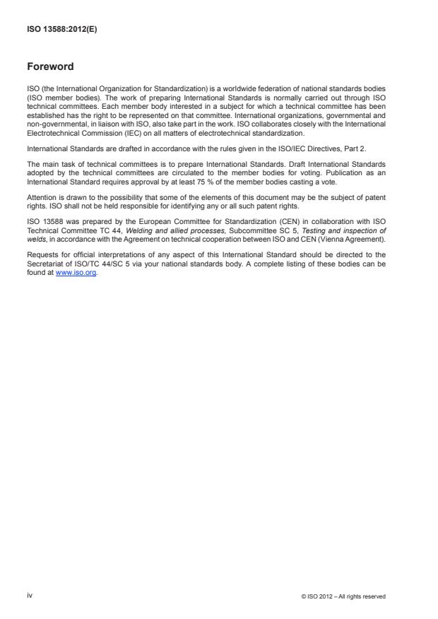 ISO 13588:2012 is classified under the following ICS (International Classification for Standards) categories: 25.160.40 - Welded joints and welds. The ICS classification helps identify the subject area and facilitates finding related standards.