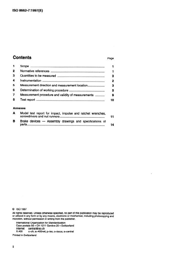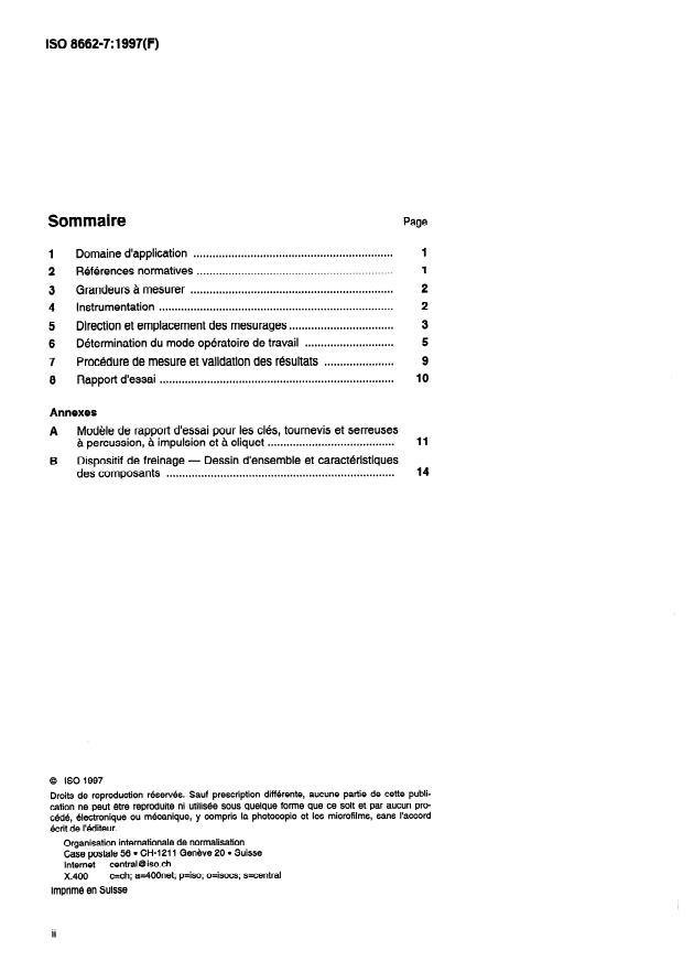 ISO 8662-7:1997 is a standard published by the International Organization for Standardization (ISO). Its full title is "Hand-held portable power tools — Measurement of vibrations at the handle — Part 7: Wrenches, screwdrivers and nut runners with impact, impulse or ratchet action". This standard covers: La présente partie de l'ISO 8662 prescrit une méthode de laboratoire pour le mesurage des vibrations s'exerçant au niveau des poignées des clés, tournevis et serreuses à percussion, à frappe, à impulsion ou à cliquet. Il s'agit d'une méthode d'essai de type permettant d'évaluer la valeur des vibrations au niveau des poignées des machines portatives fonctionnant sous une charge déterminée. La présente partie de l'ISO 8662 concerne principalement les machines à moteur portatives avec arbre de sortie à carré d'entraînement mâle ou femelle 6,3 mm à 40 mm, soit (1/4 in à 1 1/2 in); d'autres formes géométriques d'entraînement sont également incluses. Les machines à frappe unique et les clés à rochet à calage de rotor sont exclues de la présente partie de l'ISO 8662. Les machines portatives couvertes par la présente partie de l'ISO 8662 peuvent être pneumatiques ou hydrauliques. Il est prévu d'utiliser les résultats pour comparer différentes machines portatives ou différents modèles du même type de machine. Les valeurs obtenues, avec le mode de fonctionnement prescrit, donnent une indication de celles correspondant aux conditions réelles de travail, si la machine portative et la tête de l'élément de fixation sont correctement alignées.