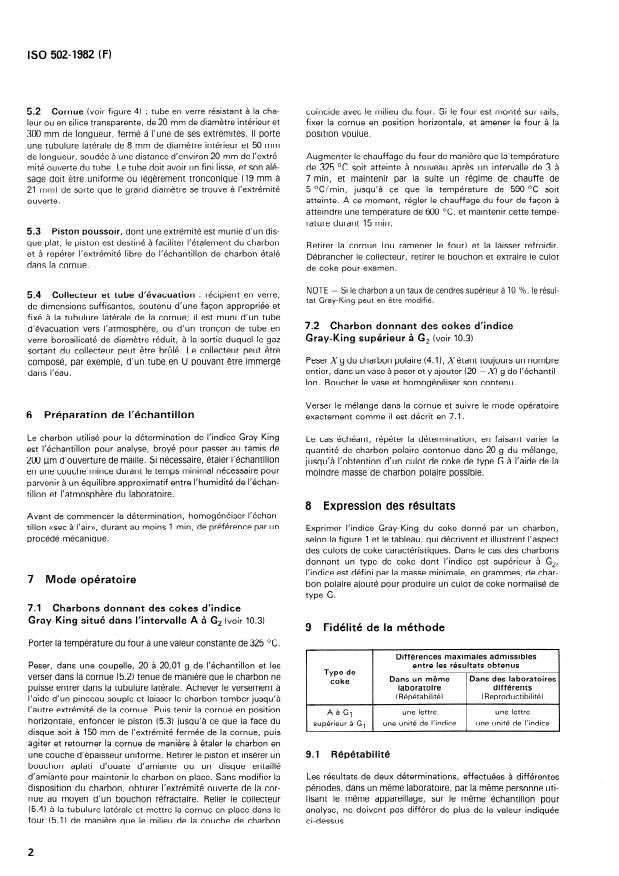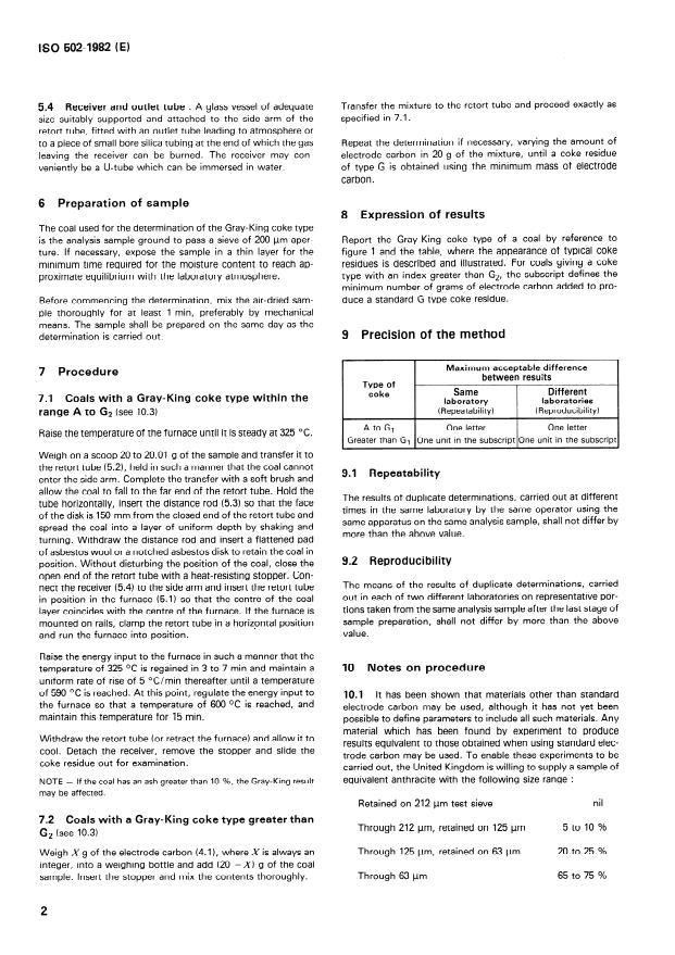 ISO 502:1982 is a standard published by the International Organization for Standardization (ISO). Its full title is "Coal — Determination of caking power — Gray-King coke test". This standard covers: The sample is heated under standard conditions to a final temperature of 600 C. The coke residue obtained is classified by reference to a series of standard residues. If the coke residue produced is so swollen that it fills the crosssection of the retort tube, the determination is repeated with the coal admixed with a suitable quantity of electrode carbon or equivalent material.
